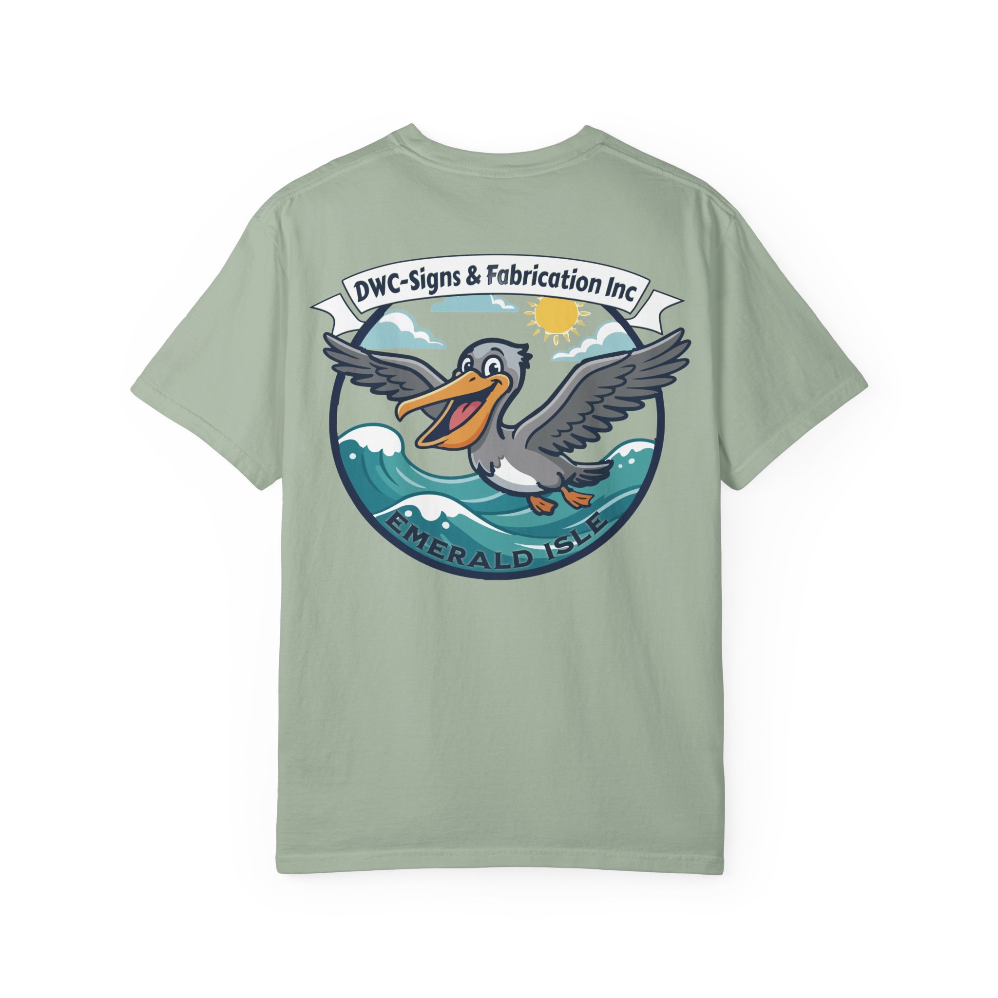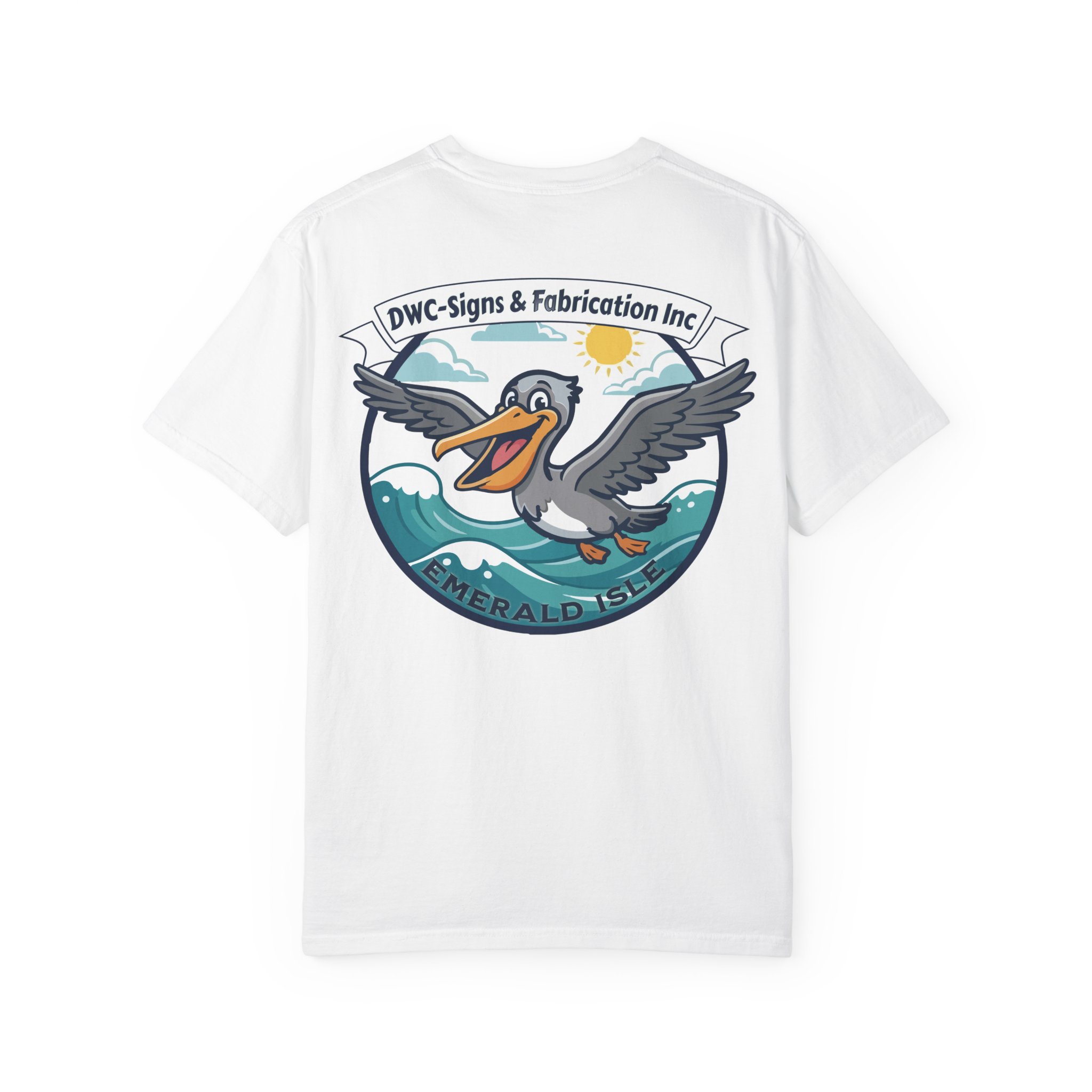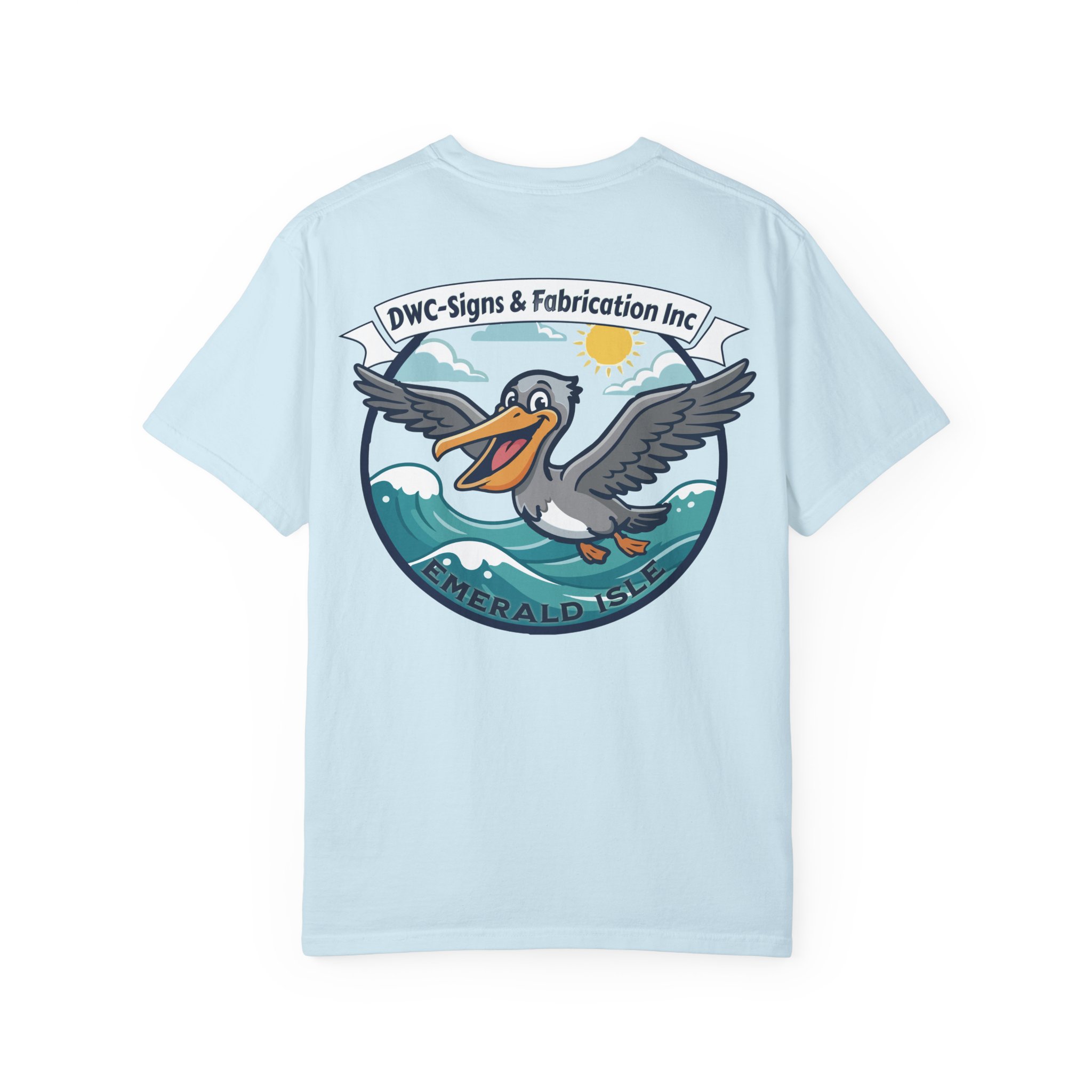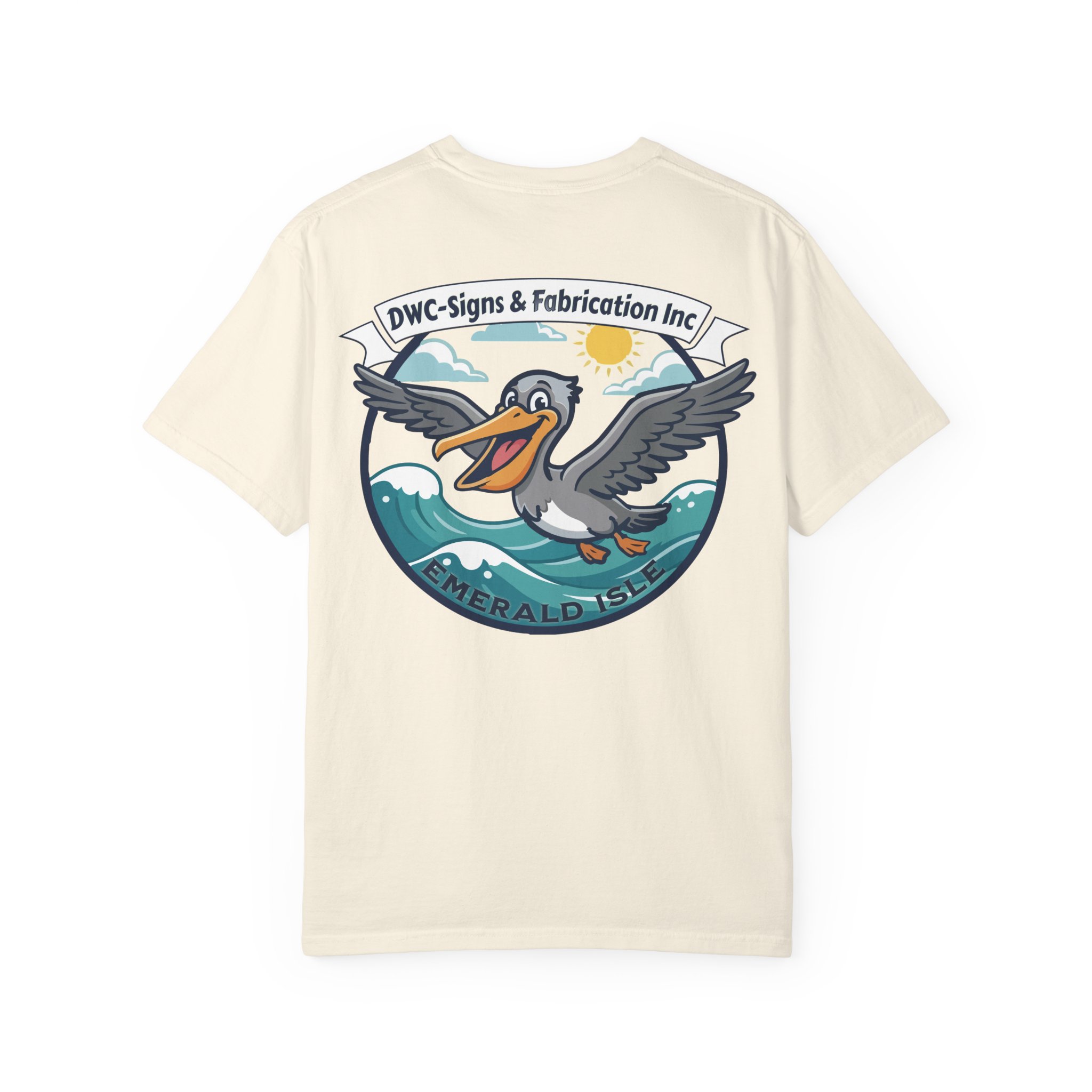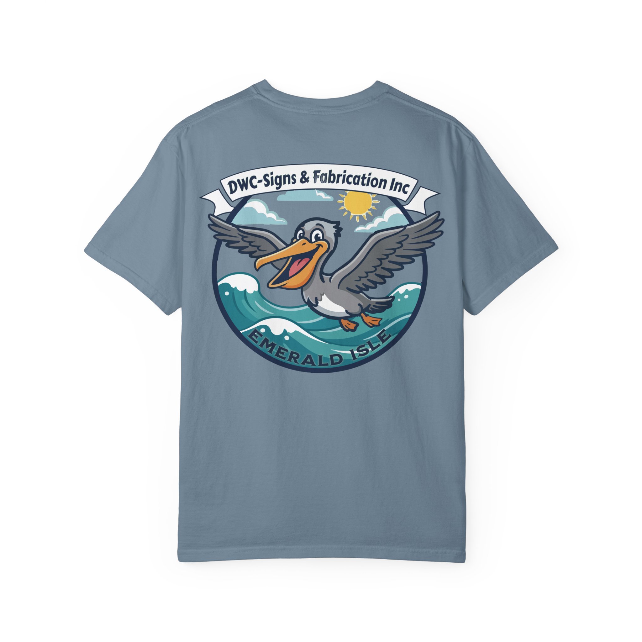 This relaxed, garment-dyed tee brings salty air and coastal charm to everyday wear. The heavyweight cotton has a soft, lived-in feel from post-construction dyeing, so the colors mellow and blend with every wash. Front chest art is small and subtle; the back features a bold, playful pelican crest riding rolling waves beneath a sunny sky. It feels like a slow morning by the harbor — coffee, sea breeze, and the hum of workshop radios. Slip it on after a long project or wear it to casual meetups with folks who appreciate solid construction and local shop pride. The relaxed cut and substantial fabric drape comfortably over layers, while the pre-shrunk ring-spun cotton and double-needle seams mean this tee stands up to repeat wear and work days alike.